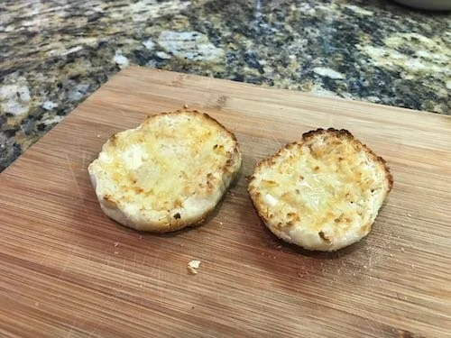 Preheat the oven to 350 degrees with the oven rack in the lower to middle position. Heat the skillet over medium high heat for 2 minutes. Gently place 4 muffins onto the skillet (you will work with 4 muffins at a time) and cooked until well puffed and lightly browned, 3-5 minutes per side (keep an eye on them as they can go from lightly browned to darkly browned quickly). Do not press down on the muffins.